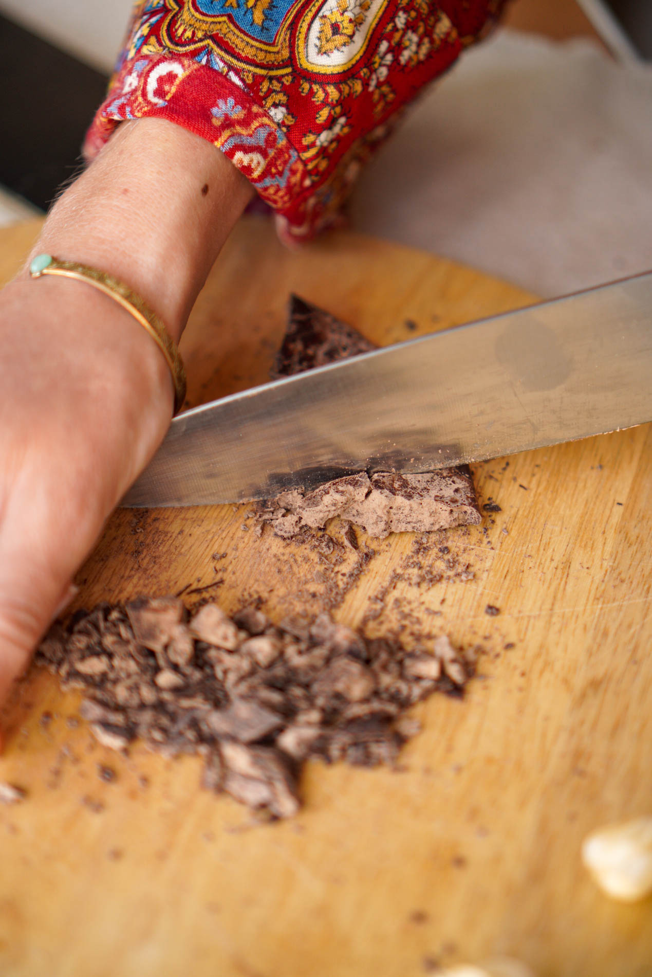 Hand-peeling follows, removing husks and sorting out defects to ensure purity. The beans are then ground back at the taller into a smooth paste, poured into bags, and left to dry at room temperature. Without tempering, each block reveals its natural white marbling.